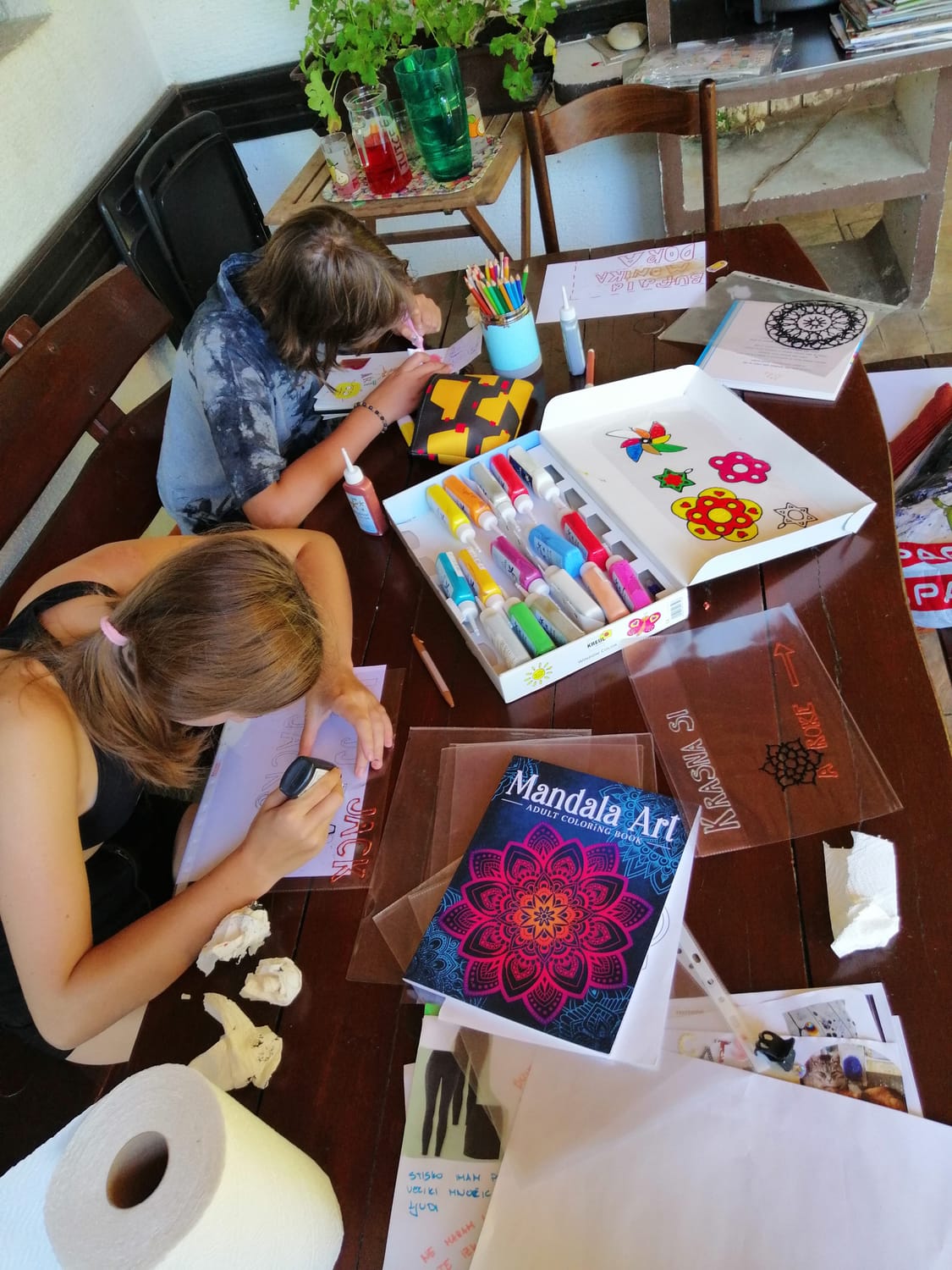 Ustvarjanje s škarjami, voščenkami, barvicami, lepili, barvami za na steklo, gnetle glino ...