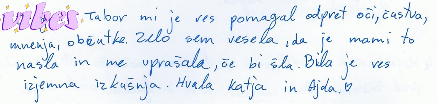 "Tabor mi je res pomagal odpreti oči, čustva, mnenja, občutke. Zelo sem vesela, da je mami to našla in me vprašala, če bi šla. Bila je res izjemna izkušnja. Hvala Katja in Ajda."