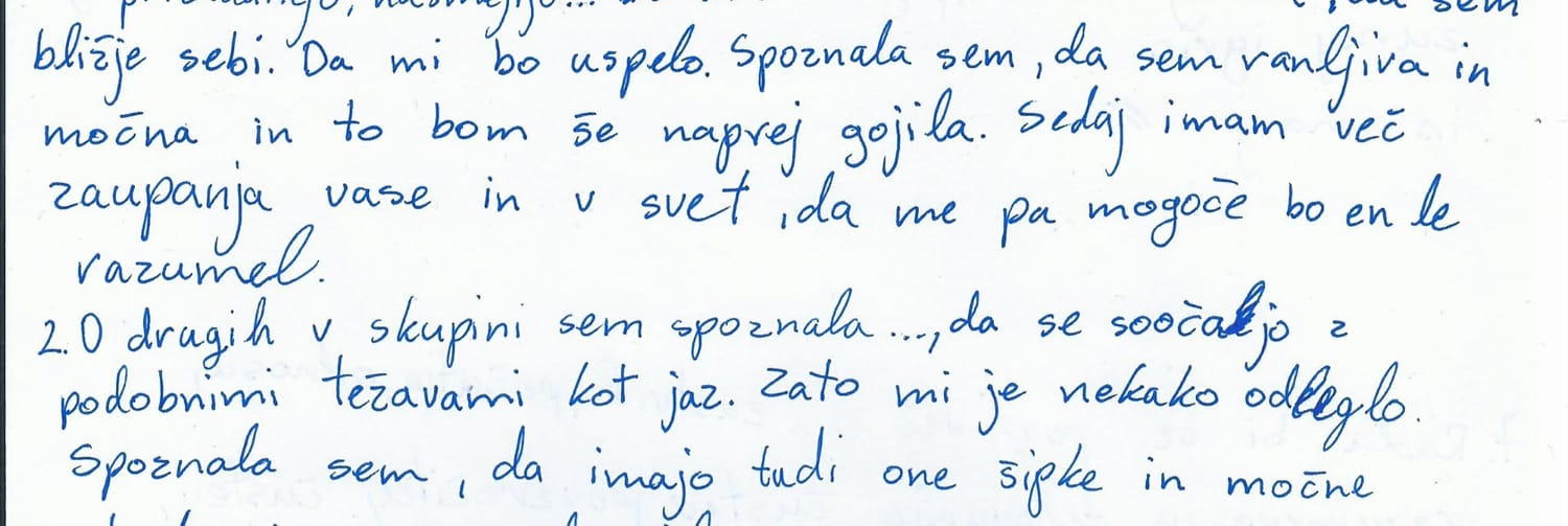 O drugih v skupini sem spoznala, da se soočajo s podobnimi težavami kot jaz. Zato mi je nekako odleglo. Spoznala sem, da imajo tudi one šibke in močne (točke) ... "